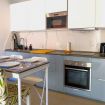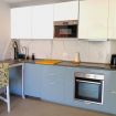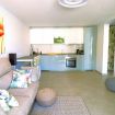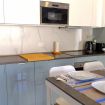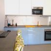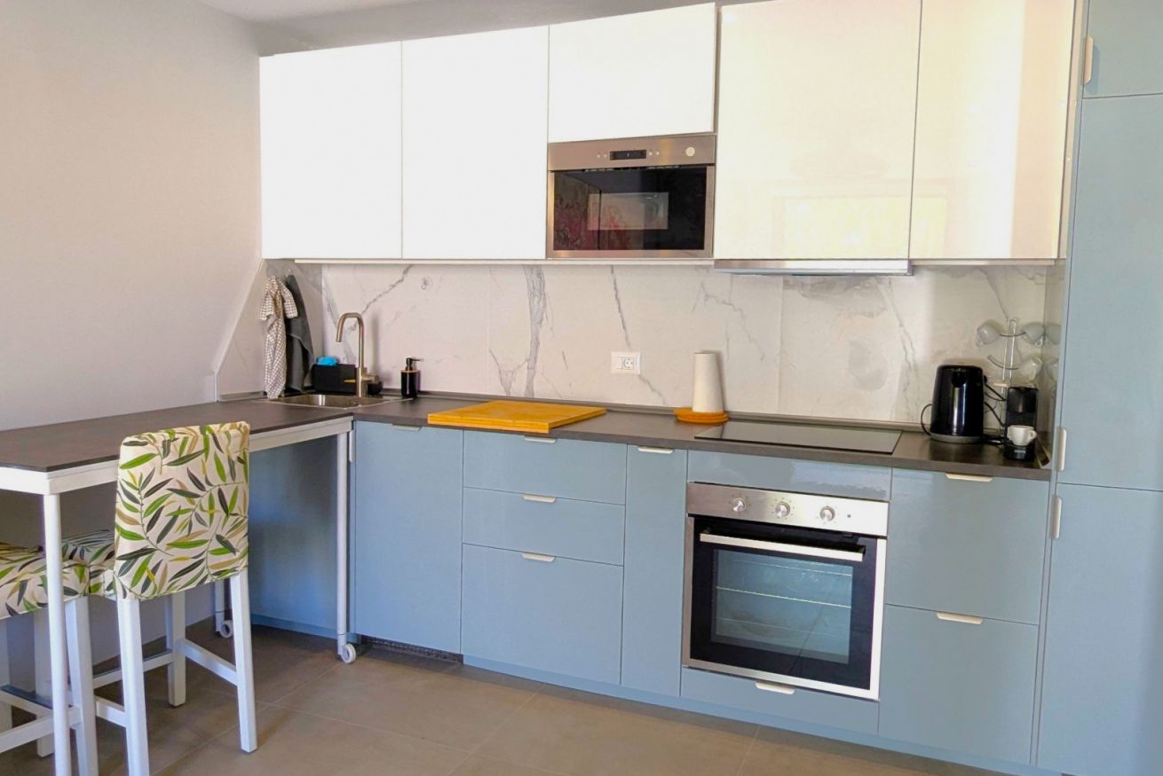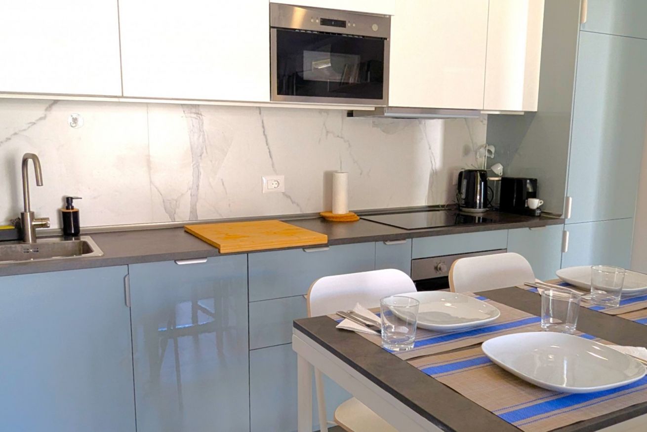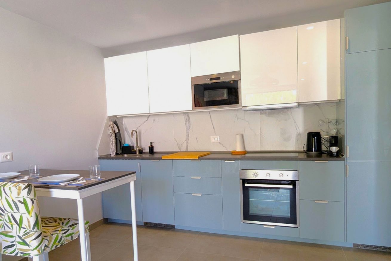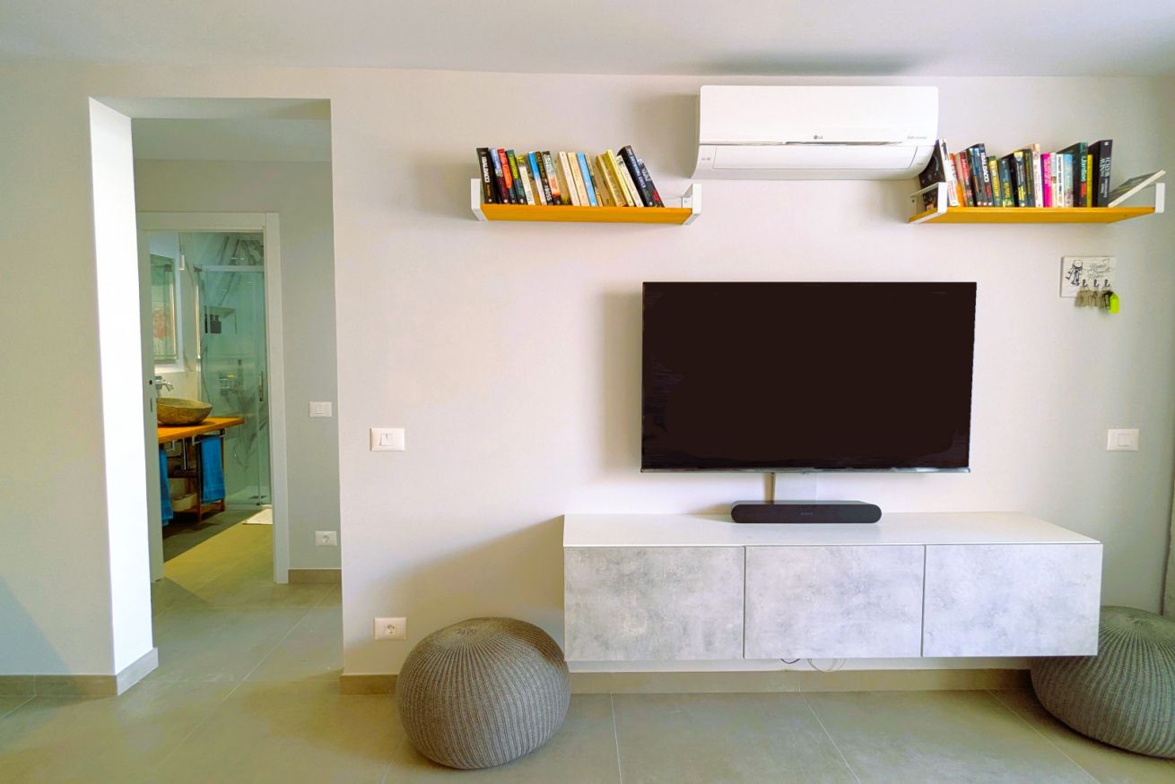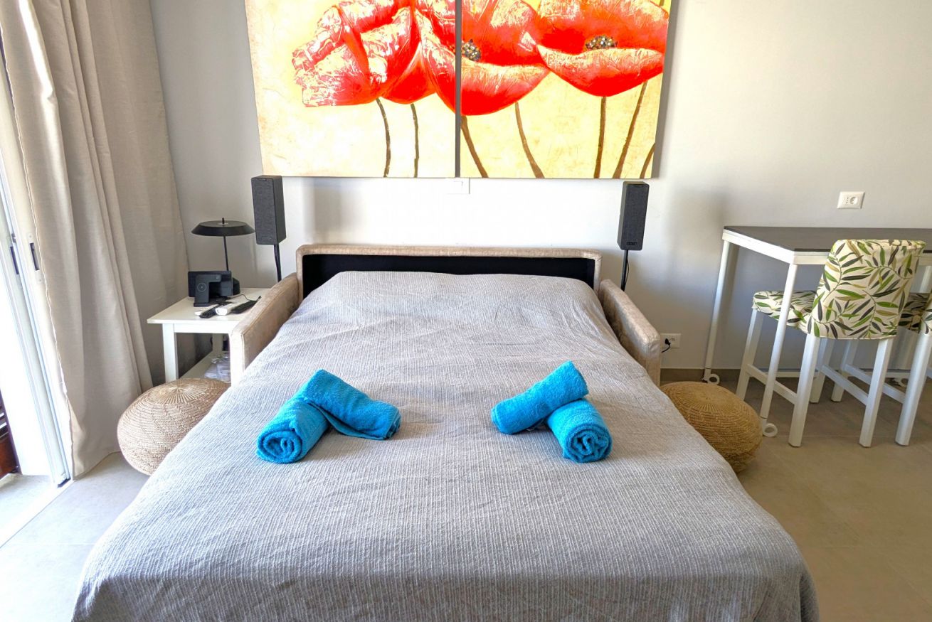 Il soggiorno è aperto su una cucina completamente attrezzata e dispone di una spaziosa zona divano con TV. Su richiesta, il divano può essere utilizzato come secondo letto matrimoniale.