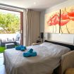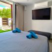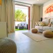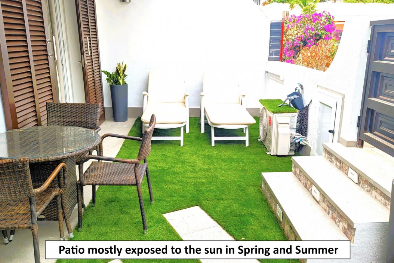 Il patio esterno di 20 metri quadrati (215 piedi quadrati), con accesso diretto alla piscina comune, ha un soggiorno con divano, tavolo da pranzo esterno e sedie a sdraio.